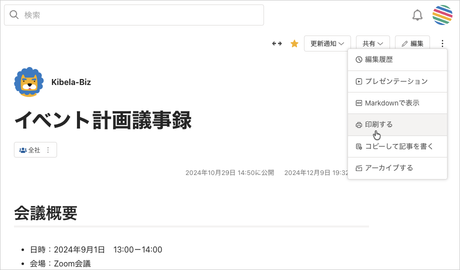 - 記事ページ右上の「…(3点)」をクリックし、「印刷する」を選択