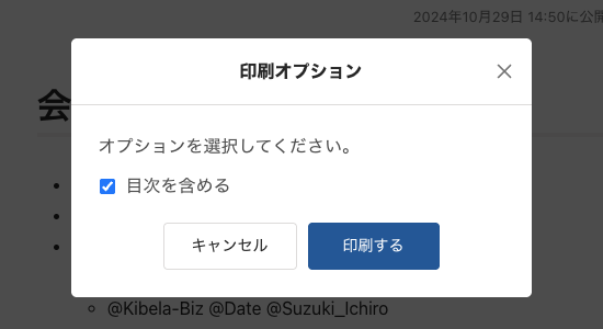 なお、ブラウザの印刷メニュー(例:⌘P / Ctrl+P)から印刷した場合は、これまで通り目次は印刷に含まれません。目次も一緒に印刷したい場合は、今回追加した「印刷する」メニューから、「目次を含める」 をONにして印刷してください。